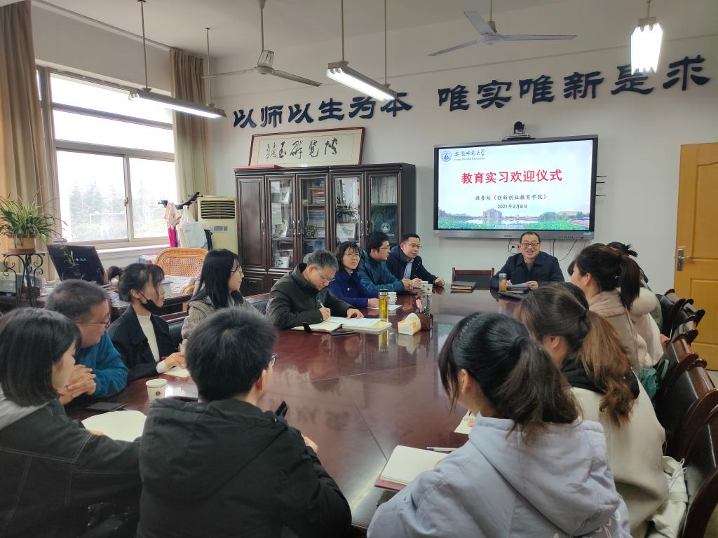 本网讯(教科院 陈丹阳 祁欣 张世钰)3月8日上午,教育科学学院2017级教育学专业实习欢迎仪式在花津校区行政楼二楼第四会议室召开。教务处崔光磊副处长及指导老师、教育科学学院教育学专业负责人徐赟及校内指导老师以及13名实习学生参加了本次会议,会议由教务处副处长李汪根主持。