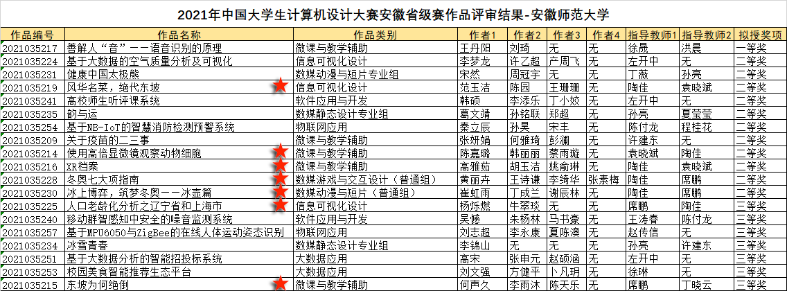 本网讯(教科院 席鹏 陶佳)2021年5月28日,中国大学生计算机设计大赛安徽省赛区传来喜讯,我院2018级教育技术学班级提交的14件参赛作品,有12件作品获奖,获奖率达85.7%。其中,省级二等奖5件、三等奖2件、优胜奖5件。与此同时,我校入围国家级比赛作品共11件,我院教育技术学专业独占4席,实现了本赛事参赛规模和历史成绩上的新突破。