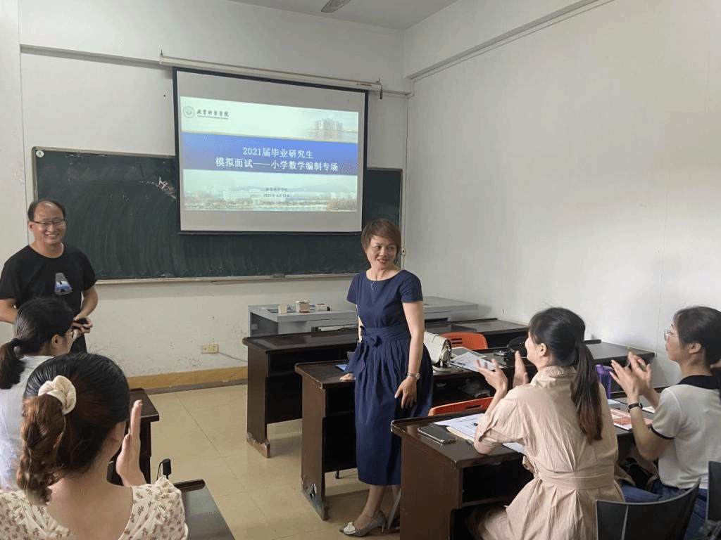 本网讯(文/张运华 图/谢伟燕)2021年6月11日至12日,教育科学学院2021届毕业研究生小学教师编制模拟面试活动在教科院研二教室顺利举行。本次模拟面试分别邀请到赭山小学副校长司马静蓉老师、育红小学教导主任黄亮老师担任小学数学组、小学语文组考官,小学教育专业硕士学位点负责人吴支奎教授担任主持,研究生办公室叶方舟老师和意向报考小学教师编制的8位研究生参加了本次模拟面试,累计40余名研究生参与旁听。