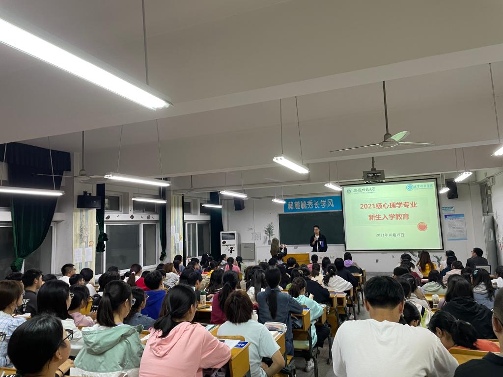 本网讯(教科院 余梦漪)10月15日晚七点半,教育科学学院在田家炳楼8402教室召开了2021级心理学专业新生入学教育大会。心理学专业负责人韩建涛老师、21级专职辅导员张理强老师、班主任薛红莉老师、2018级优秀学生代表陶芮、孟玉洁,以及2021级心理学专业全体本科新生参加会议。
