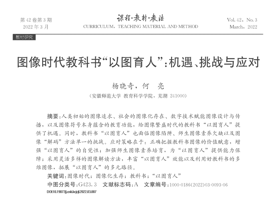 人类初始的图像追求、社会的图像化存在、数字技术赋能图像设计与传播,以及图像符号本身蕴含的教育功能,给图像繁盛时代的教科书“以图育人”提供了机遇。同时,教科书“以图育人”也面临图像陷阱、师生图像素养欠缺以及图像“解码”方法单一的挑战。应对策略在于:正确把握教科书图像的价值赋意,增强“以图育人”的自觉性;加强师生图像素养培育,为“以图育人”提供能力保障;采用灵活多样的图像解读方法,丰富“以图育人”效能以及利用好教科书的多维图像,拓展“以图育人”的多元路径。