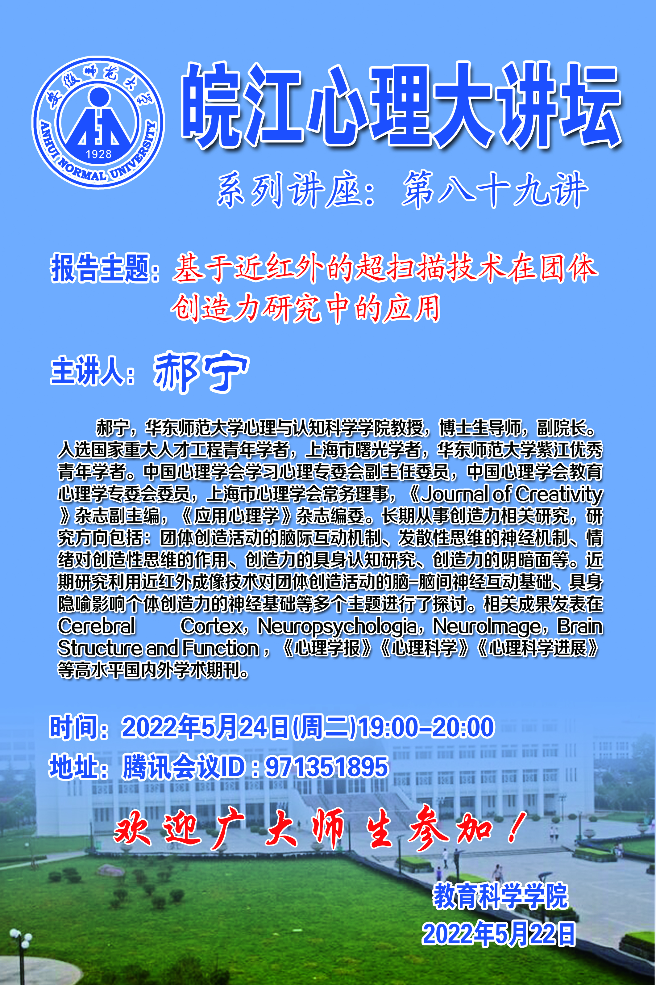 【学术预告】皖江心理大讲坛第八十九讲:基于近红外的超扫描技术在团体创造力研究中的应用