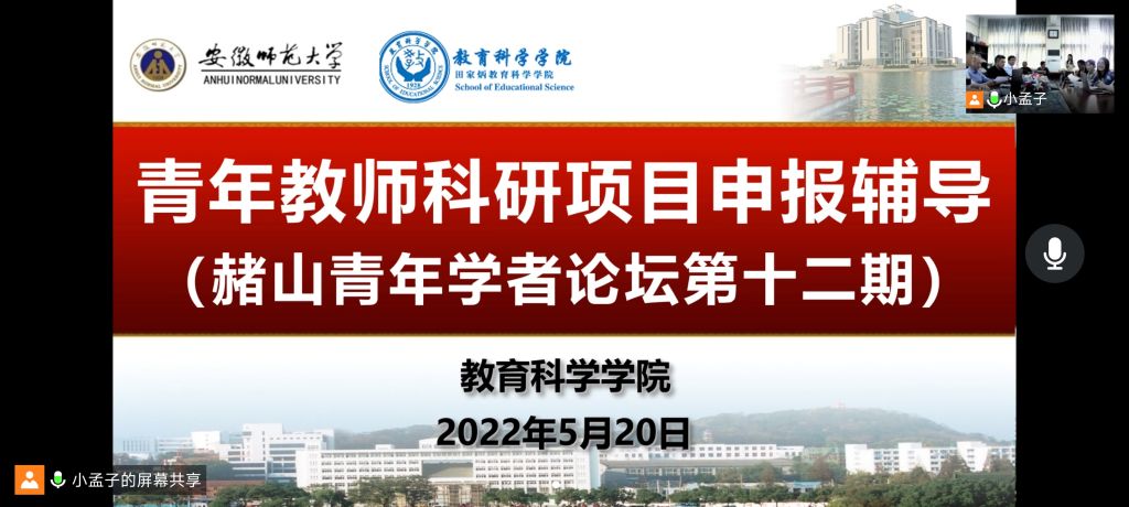 2022年5月20日下午,“赭山青年学者论坛”(第十二期)以线上线下相结合的方式在教科院408会议室如期开讲。为进一步和有针对性地推动青年教师申报安徽省哲学社会科学项目工作,此次论坛主题特定为“青年教师科研项目申报辅导”,特邀安庆师范大学曹长德教授,教育科学学院阮成武教授、李宜江教授、赵必华教授参加指导。论坛由吴文涛副院长主持。