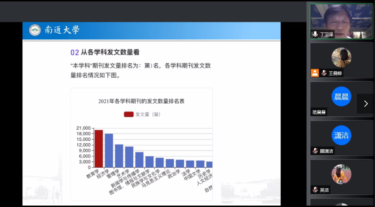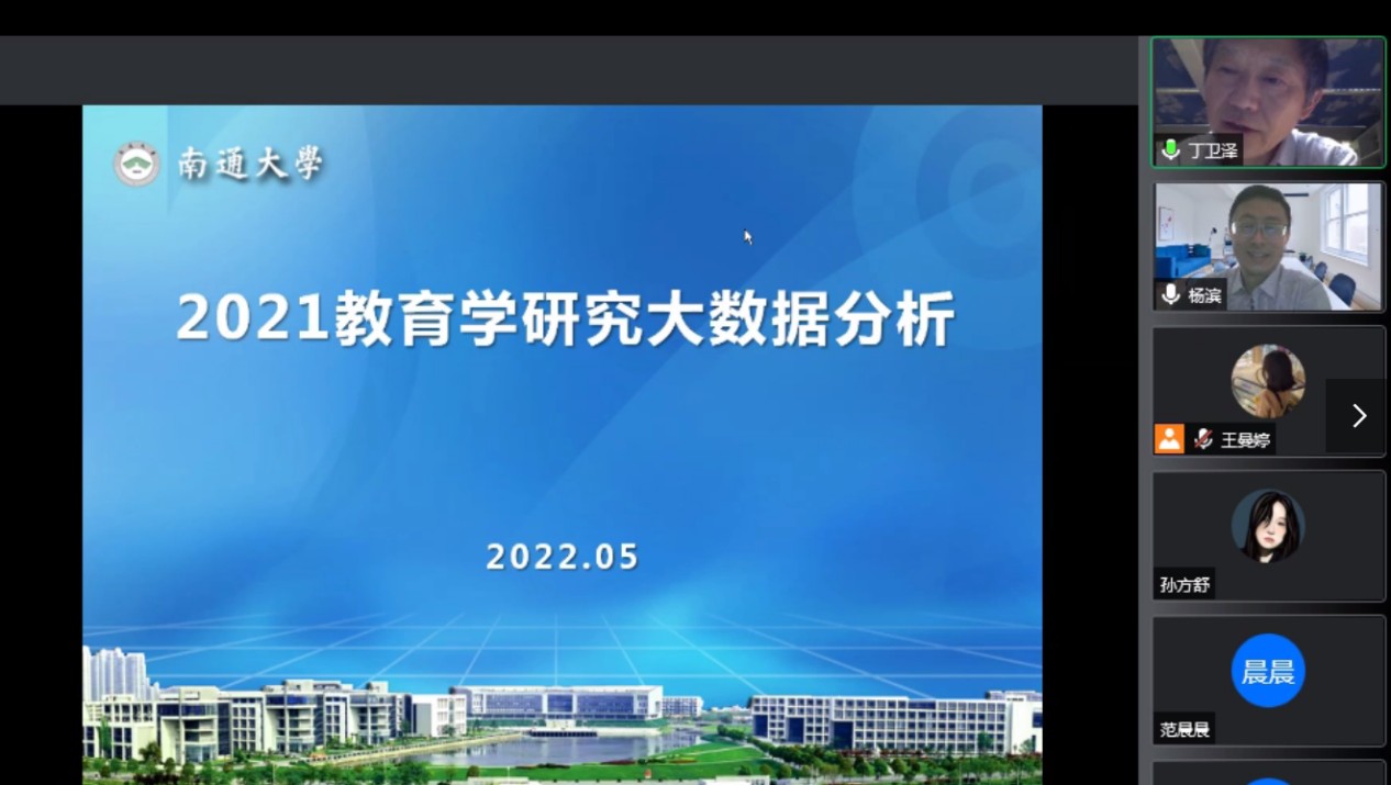 本网讯(图/文 钟璐)5月22日下午,南通大学丁卫泽教授应教育科学学院邀请与我院师生开展线上学术交流,并作了题为“2021教育学研究大数据分析”的专题讲座。讲座通过腾讯会议举行,由杨滨教授主持,全体教育技术学、现代教育技术专业硕士研究生线上参会。