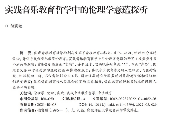 实践音乐教育哲学批判与反思了音乐教育与社会、文化、政治、伦理相分离的做法,并倡导复归音乐教育伦理学。实践音乐教育哲学关于伦理学意蕴的研究主要聚焦于三个方面的洞察:首先音乐教育是“实践”,并非技术,它的服务对象是“人”,不是“产品”,因此有义务和责任关注学生的权益和持续性成长;其次音乐教育作为助人型职业,与医疗实践、法律援助一样,不仅需做好分内工作,同时还要对它所服务的对象持有关怀和保证他们不受伤害;最后音乐教育与人类社会的发展息息相关,音乐教育的终极目的应是促进人类福祉的实现。
