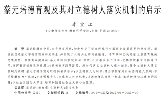 蔡元培融合中西、古今德育思想,初步形成了适合近现代中国社会发展需要的德育观。道德救国是蔡元培德育观的历史场景,并体现了人德共生的内在蕴意。培育共和公民是蔡元培德育观的思想实质。在德育落实方面,蔡元培提出重视家庭、学校、社会教育合力作用,发挥学校教育主阵地作用,发挥教师榜样示范作用,注重德育实践等路径。新时代落实立德树人根本任务,健全立德树人落实机制是关键,蔡元培德育观可以提供诸多启示:以立德树人为引领,健全学校家庭社会协同育人机制;以学校教育为主阵地,完善课程育人、文化育人共生机制;以师德师风为第一标准,推动教师初心使命的践履;以社会实践为大课堂,培育和践行社会主义核心价值观。