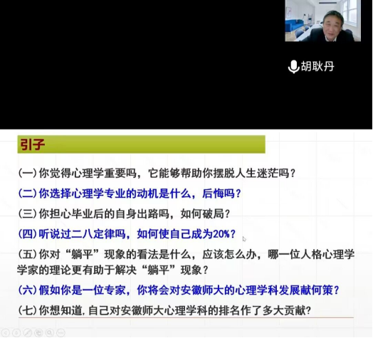10月26日下午,同济大学心理学系学科带头人、博士生导师胡耿丹教授应邀做客我院皖江心理大讲坛第九十六讲,为我院师生作《学科交叉背景下心理学科的功能定位和发展路径》的学术讲座。讲座由我院博士生导师桑青松教授主持,心理学系教师以及全体心理学硕士和部分博士研究生线上聆听学习。