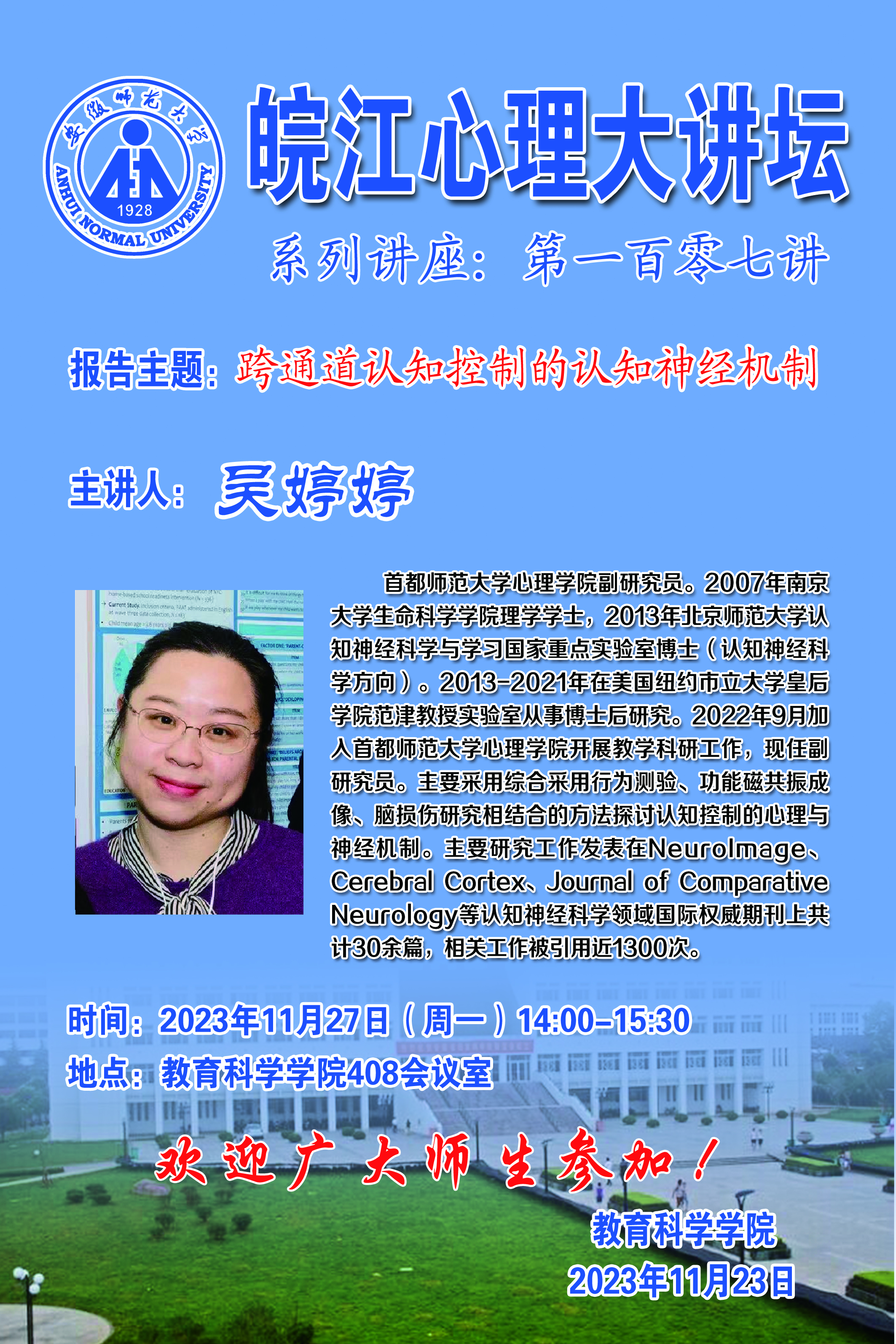 【学术预告】皖江心理大讲坛第一百零七讲——吴婷婷:跨通道认知控制的认知神经机制