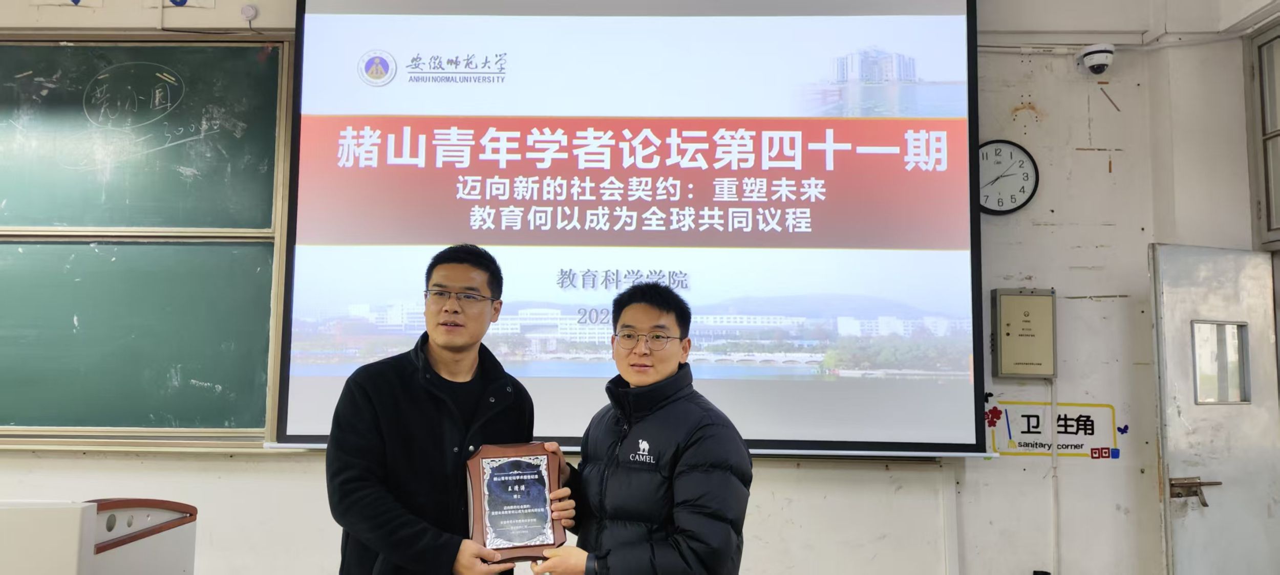 2025年3月5日下午,第四十一期“赭山青年学者论坛”在赭山校区田楼8101教室成功举办。本次论坛邀请学院青年教师王清涛博士担任主讲嘉宾,围绕“迈向新的社会契约:重塑未来教育何以成为全球共同议程”主题展开深度探讨。学院副院长吴文涛、研究生辅导员莫大贡、一二年级教育学研究生参加活动。讲座由2024级研究生谢欣主持。