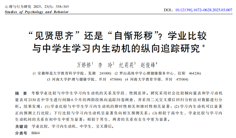万娇娇等:“见贤思齐”还是“自惭形秽”?学业比较与中学生学习内生动机的纵向追踪研究
