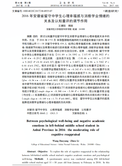 王道阳 周丽:2016年安徽省留守中学生心理幸福感与消极学业情绪的关系及认知重评的调节作用