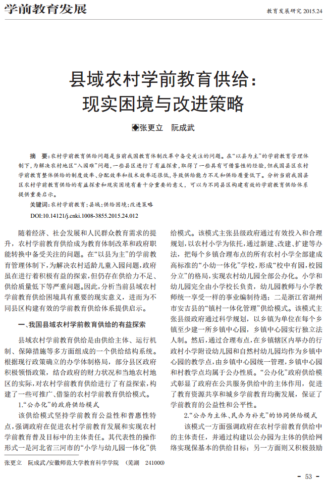 张更立、阮成武:县域农村学前教育供给: 现实困境与改进策略