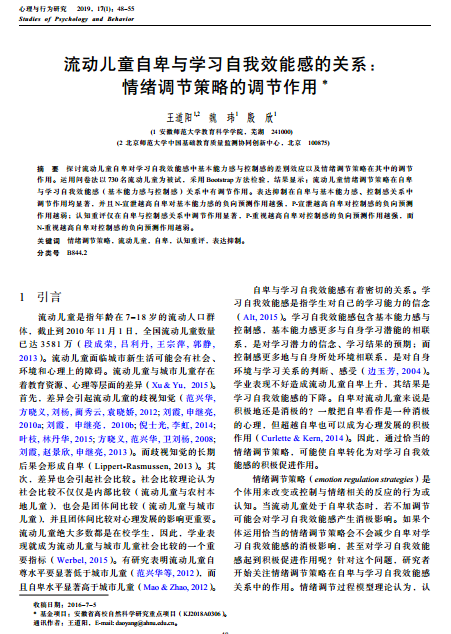 王道阳,魏玮 等:流动儿童自卑与学习自我效能感的关系:情绪调节策略的调节作用
