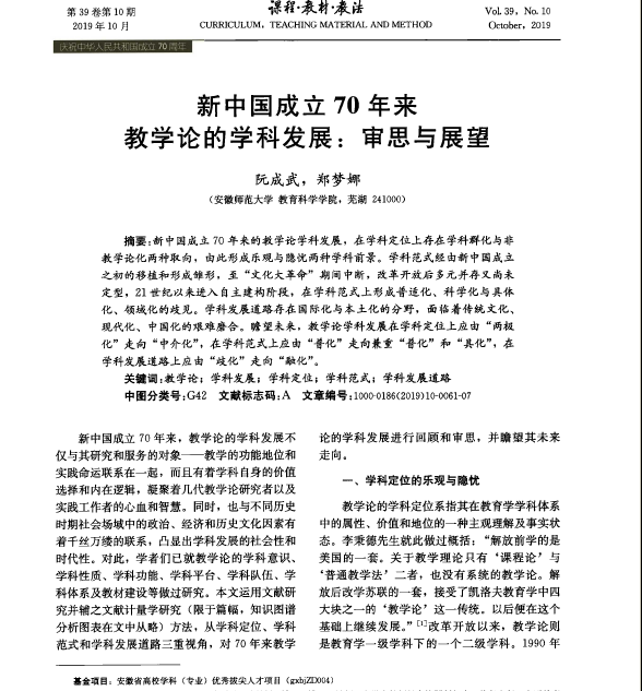阮成武,郑梦娜:新中国成立70年来教学论的学科发展:审思与展望