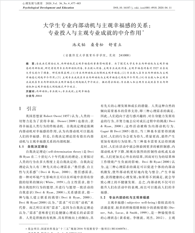 池文韬,桑青松,舒首立:大学生专业内部动机与主观幸福感的关系:专业投入与主观专业成就的中介作用