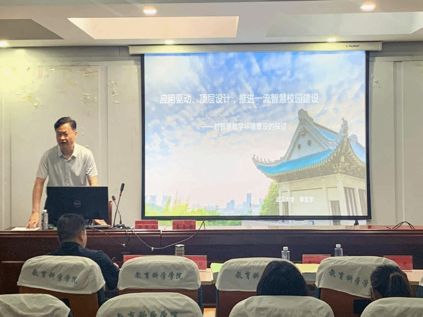 本网讯(教科院 文/谢伟燕 图/康娅婷)5月31日下午,武汉大学教育技术与教学服务中心副主任、高级工程师季至宇应邀来我院作“应用驱动、顶层设计,推动一流智慧校园建设——对智慧教学环境建设的探讨”主题讲座。本次讲座于教育科学学院三楼学术交流中心举行,由我院教育技术学学位点负责人、博士生导师聂竹明教授主持,教育技术学、现代教育技术等专业研究生到场聆听和学习。