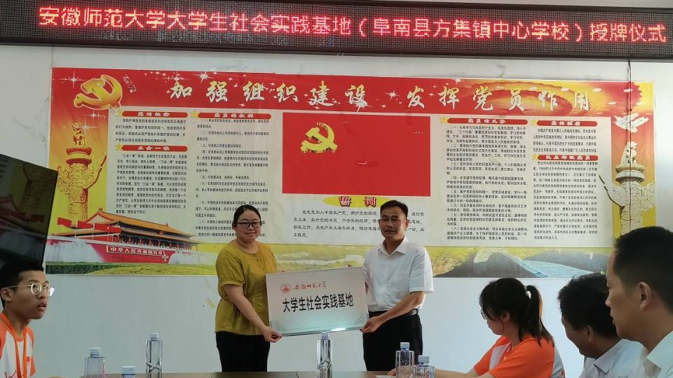 为深入了解暑期社会实践开展情况,对接阜南县进行深入合作,7月12日上午,阜南县方集镇党委书记李光、方集镇中心学校校长张孝成与院党委副书记杜凤、小学教育专业负责人王芳、团委副书记蔡文、实践指导老师莫大贡一同来到阜南县方集镇看望教科院“全心全益”赴阜南县“赤橙青年”暑期社会实践团队并对实践点进行了授牌。