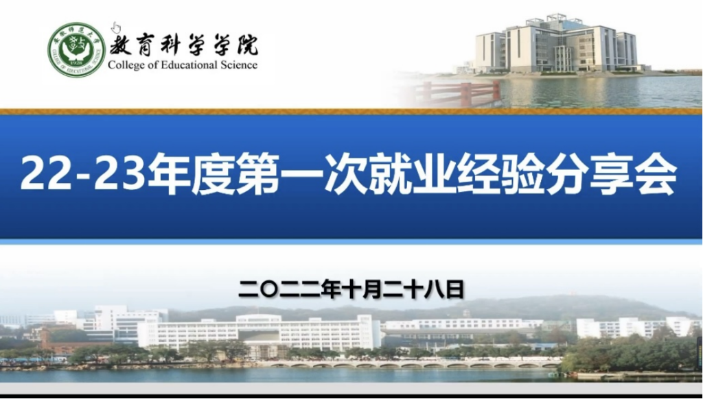 为进一步夯实教育科学学院研究生就业技能,拓宽2023届毕业生就业视野,学院研究生会邀请优秀院友,面向毕业班研究生和其他有意向的学生,开展“育”见未来 “研”途相伴就业分享会。10月28日晚,学院2022-2023年度硕士研究生就业经验分享会系列活动拉开帷幕。毕业班辅导员程啸老师和三位优秀校友参加此次分享会,院研究生会校友部赵小娇主持,近百名硕士研究生积极参与,在线交流学习。