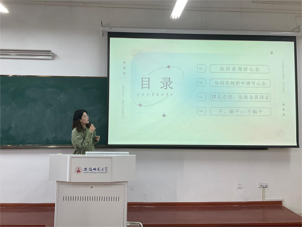 为增强研究生生涯规划与职业发展意识,提高学院择业引导、就业帮扶工作的针对性,4月2日下午,教育科学学院在教学楼1311召开了第四期研究生就业分享会。本期分享会以高校心理中心就业为专题,邀请2014级硕士研究生聂余、2017级硕士研究生赵慧宇及2020级硕士研究生李梦圆三位优秀校友介绍就业经验,畅谈求职感悟。会议由校友部苏亚男主持,团委副书记付银行、全体心理学和心理健康教育专业在校研究生参与。