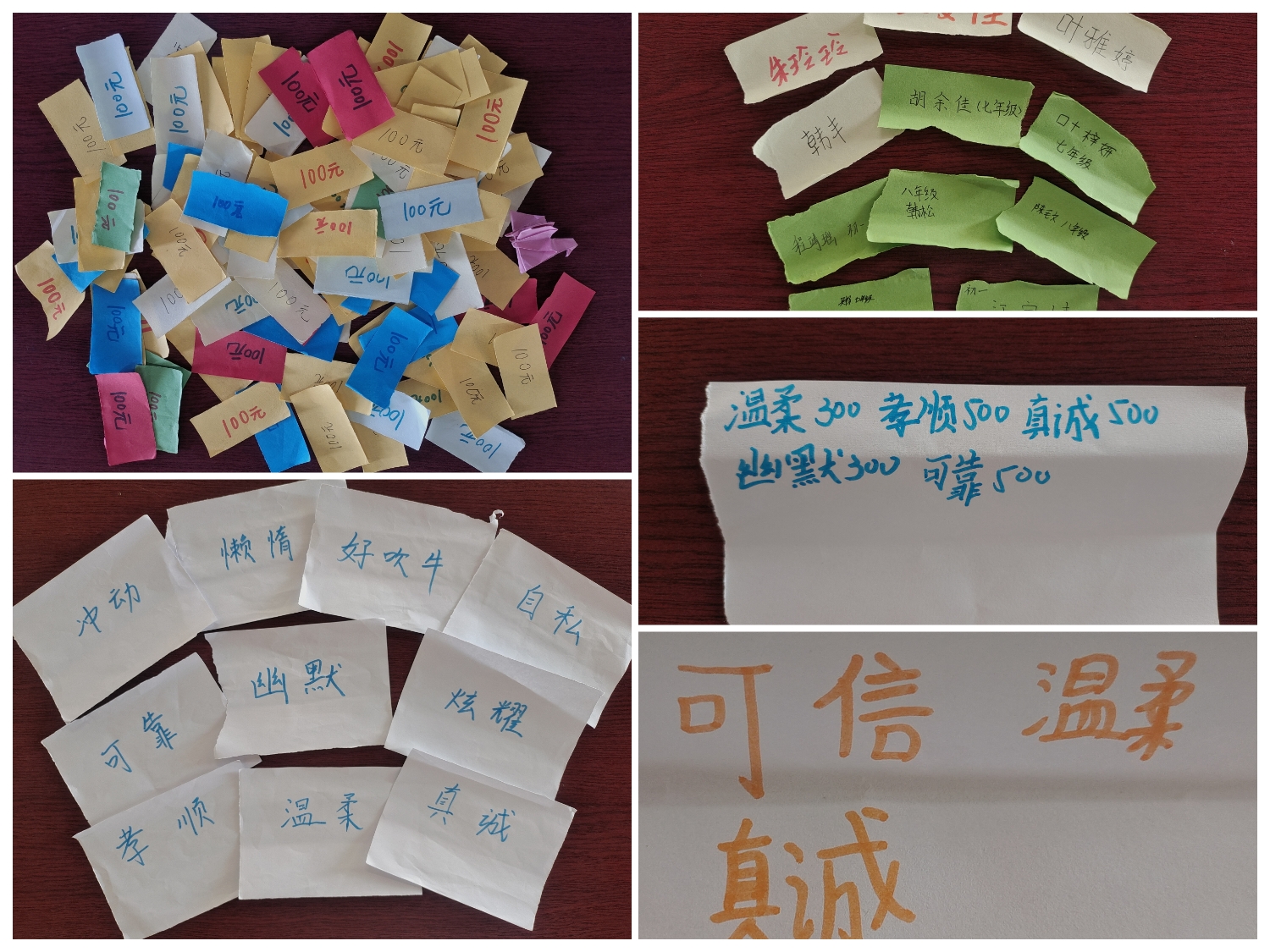 接下来,团队进行了一个名为“品质拍卖会”的活动。活动开始前,学生们会得到一些“虚拟”纸币,这些“虚拟”纸币均是由大家共同合作完成。进入拍卖环节后,每个同学都有机会使用手中的纸币竞拍自己认为最珍贵的品质。进行两次拍卖后,课堂气氛也变得十分活跃,大家积极地分享了竞拍各种品质的原因,并表达了对朋友的期望。队员和孩子们也在一次次拍卖活动中收获幸福与快乐。