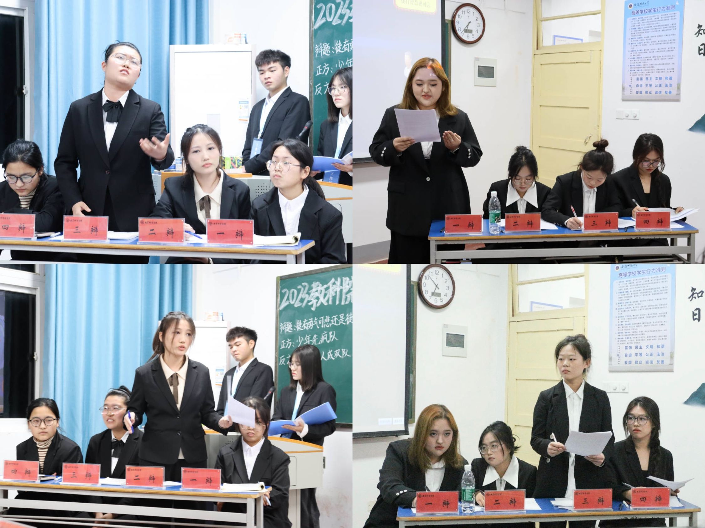 2023年11月19日晚,教育科学学院于天门山校区北教学楼310举办“I·辩论”辩论赛决赛。院团委书记付银行,2023级辅导员金凤仙、刘玉瑾,教科院辩论队队长岳辰硕、副队长朱雨阳为本次比赛评委。