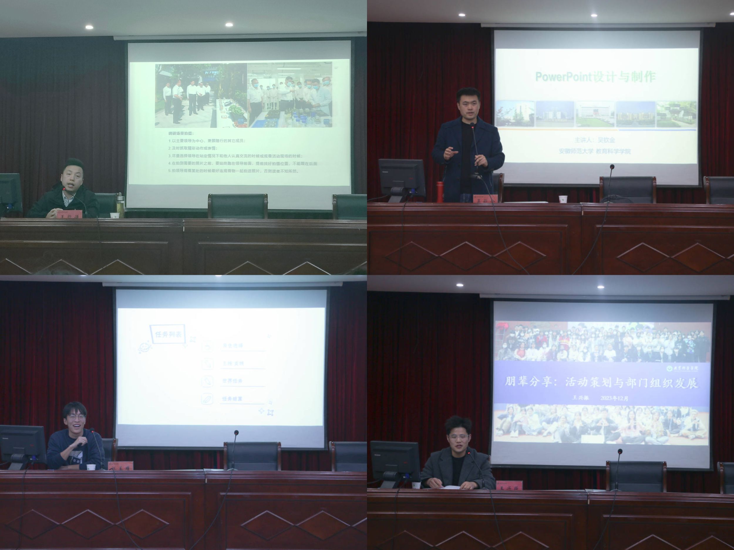 技能成才是每一位教科学子的担当与使命。校党委宣传部王哲谦老师开展《新闻稿的撰写和摄影》主题讲座,详细地介绍了新闻稿的相关知识及新闻稿撰写的注意事项,并结合自己拍摄的图片讲述摄影技巧。教育技术学专业教师吴钦金开展《PPT的制作》专题讲座,他结合实际的案例详细讲述了与PPT制作相关的排版、美观性、逻辑性等方面的内容,鼓励各位同学在日常生活中加强练习,不断提高PPT制作能力。23级辅导员刘玉瑾结合自身在本科阶段及研究生阶段的学习生活与支教经历进行了《时间与工作的平衡和志愿服务活动》专题讲座,为同学们平衡学习与工作提供了有效的方法与手段,勉励各位同学积极参与志愿服务,提升综合素质。2020级教育技术学专业王兴振在《部门建设和身份意识的转变》专场讲座中结合自己在学生会的工作经历现身说法,强调身份意识的重要性以及部门建设过程中的注意事项,鼓励各位同学为部门建设贡献自己的力量。校团委老师王申振倾情为我们讲解了“挑战杯”相关项目,他结合具体案例具体分析重点讲述了“挑战杯”计划书的撰写与汇报PPT的制作并鼓励学生发挥专业所长积极投身“挑战杯”相关赛事中,不断提升自己的能力。