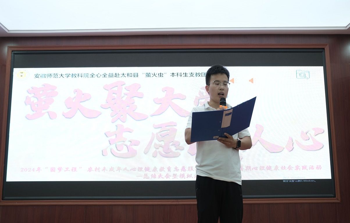 盛夏七月,教育科学学院“萤火虫”团队在太和县蔡庙镇中心学校开展为期16天的支教活动,在“萤火聚大爱,志愿暖人心”总结大会中圆满落下帷幕。两周可能不足以传递全部的知识,却能为孩子们带去对知识的敬畏与热情;两周也许无法彻底消除迷茫,但能为孩子们带去温暖与欢笑;两周可能无法改变他们的一生,却能为孩子们带去追逐梦想的勇气与毅力。这个夏天不只有烈日和蝉鸣,更有孩子们的欢声笑语和支教队员们的盈盈爱意,一个个动态瞬间,定格永恒,组成了“萤火虫”五彩斑斓的夏日支教之旅。