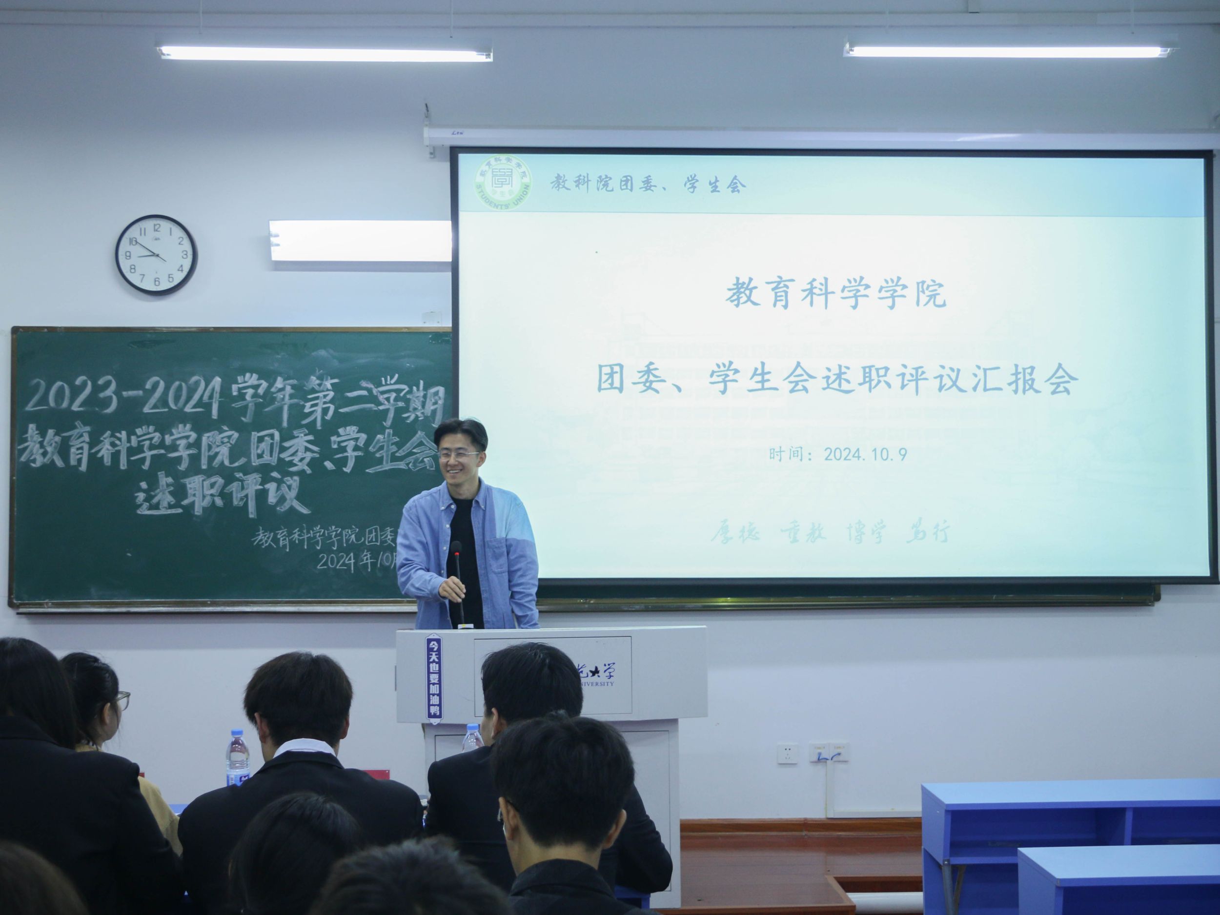 为落实大学生护航行动计划,2024年10月9日晚,教育科学学院团委、学生会于教学楼1202举行2023-2024学年述职评议汇报会。院团委书记付银行、校学生会主席陈妍文、团委、学生会全体成员和24级部分班委参加此次会议。