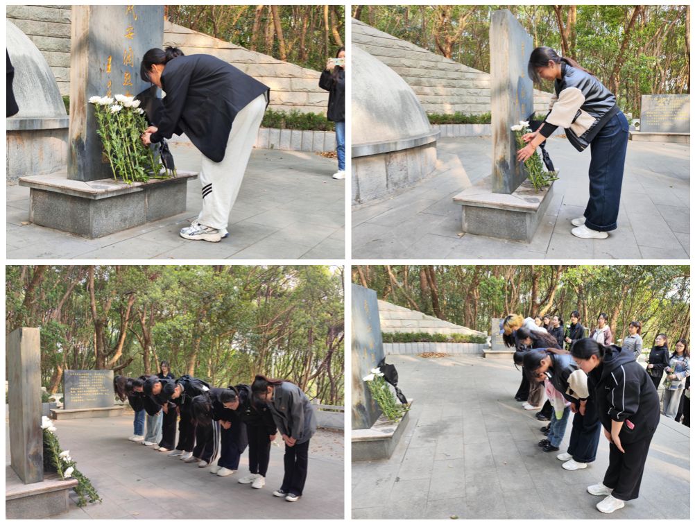 仪式结尾,各专业同学整齐列队手持白菊花有序进行献花,并一同走向戴安澜烈士墓前进行三鞠躬,全体同学肃立默哀,深切悼念抗日英雄戴安澜烈士。