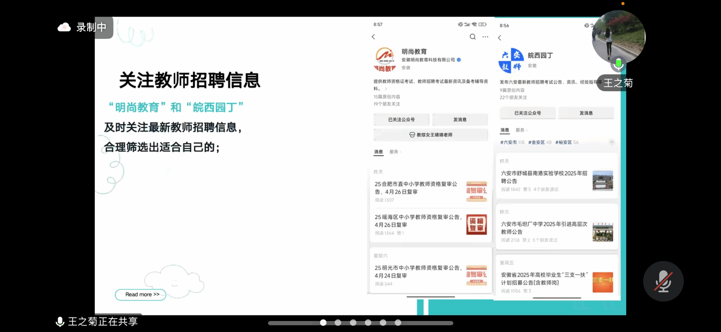 分享会上,四位校友结合自身职业路径提供实战指导。现任毛坦厂中学教师的王之菊详解教师编制备考策略,建议关注权威教育公众号获取招聘信息,笔试阶段强化教育学核心知识背诵与真题训练,面试时注重“去套路化”试讲,通过视频复盘提升表现力。昆山康桥国际学校教师陈迩桐分享私立学校求职技巧,强调面试中需塑造专业“人设”,通过模拟演练展现职业热情,并主动匹配岗位需求。安吉县第二小学教师纪升针对校招流程,提出简历需突出教学实践成果,面试中融入板书设计与创新教学环节以增强竞争力。安徽财贸职业学院辅导员黄雅芬系统解析高校辅导员岗位备考,建议利用信息化工具筛选招聘信息,整合岗位核心职责与政策要点形成应答模板,并在面试中结合校史展现岗位适配度。
