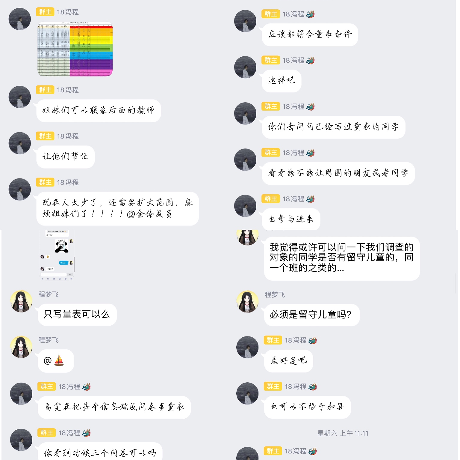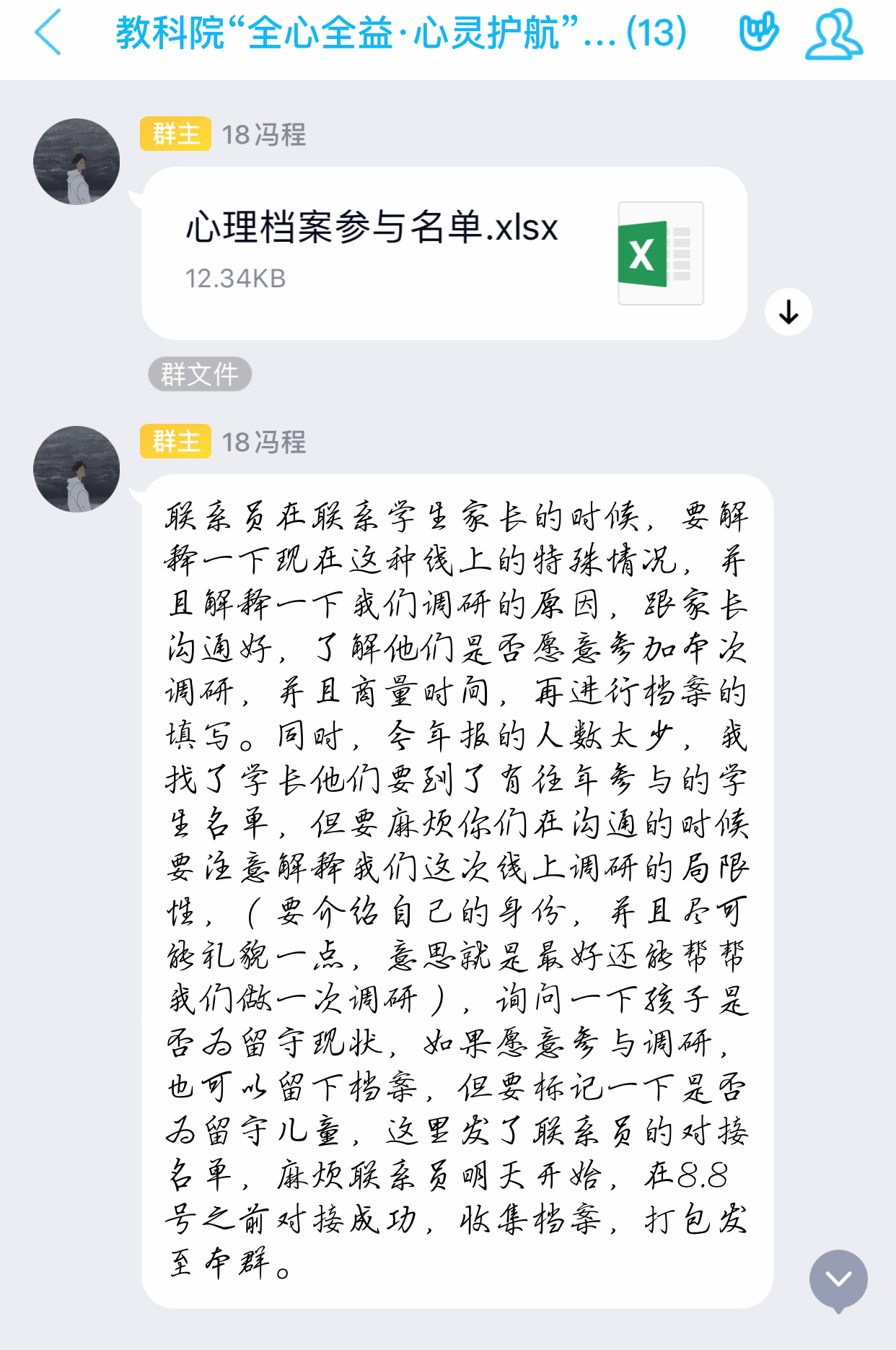 活动中,“全心全益·心灵护航”团队成员通过电话、视频等方式对留守儿童展开教育工作,密切关注相关儿童的家庭情况、心理状态和实际困难。在其他团队的帮助下,该团队收集了有关留守儿童的心理档案。除此之外,队长冯程还在团队群中发布了今年参与心理档案调研的名单,对每位联系员进行了分配,提出合理性建议,要求联系员在下一阶段前对接成功,收集档案。