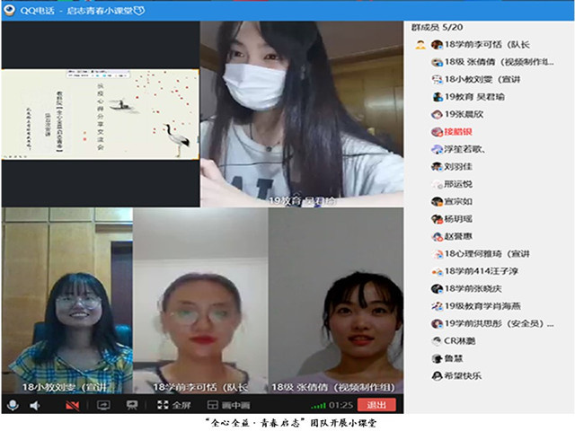 8月18日晚七点,“全心全益·青春启志”团队正式召开第一次主题宣讲活动。主持人18级学前教育专业李可恬以疫情的心得体会为切入点,回顾了疫情初期的恐慌和我国有效的抗疫措施,并由衷地为全国齐心协力、共克时艰的精神点赞。接着,18级学前教育专业张倩倩分享了此次疫情给人们的生活造成的众多影响,比如部分个体商户从辉煌走向寥落,居民禁止走亲访友等。