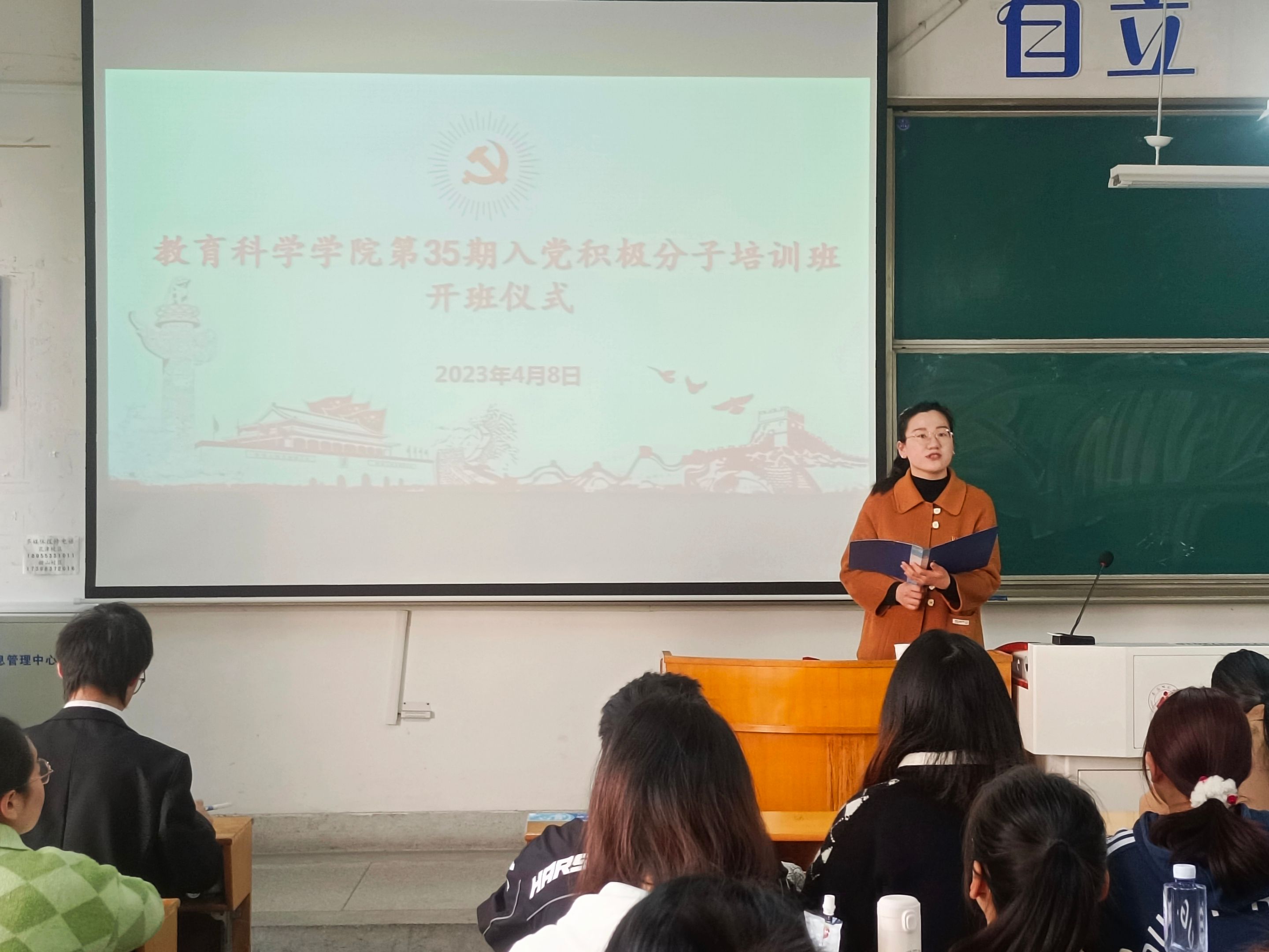 为进一步提高入党积极分子的党性修养,厚实党的理论知识,端正入党动机。4月8日上午8点,教育科学学院第35期入党积极分子培训班开班典礼在田楼8210教室举行。院党委副书记杜凤、班主任赵茜以及本期培训班全体学员出席开班式。