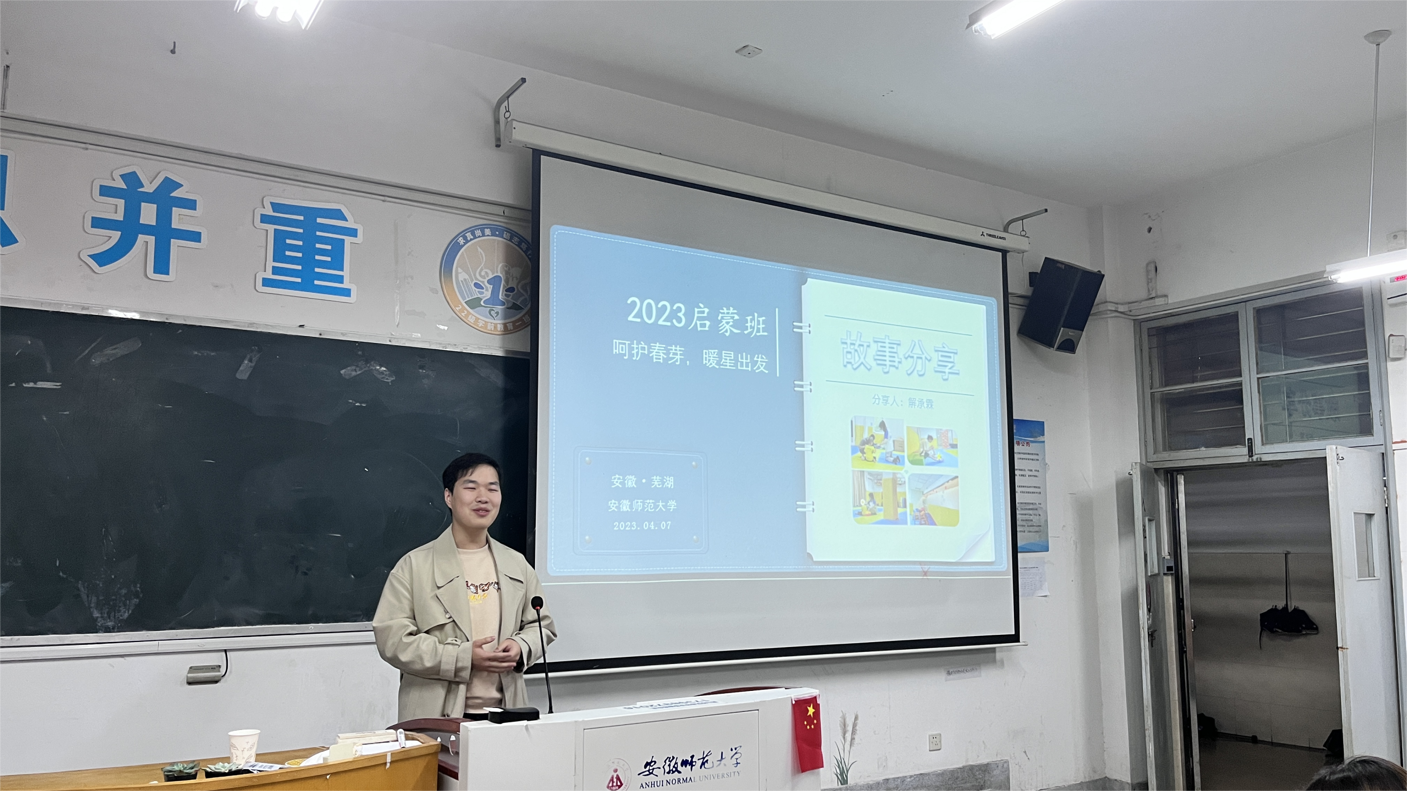 研支团成员施羽晗和夏卓妍向同学们分享研支团的经历。施羽晗身为第十届支教团的成员,2018年到2023年,从倾听者转变为讲述者,从安徽出发,奔向祖国西南地区,关爱留守儿童,参加公益活动,开展农村青年创业课。将温暖传递下去,将脱贫攻坚的国家号召落实到实处。她送给学员们一句话:“用一年的时间去做一件终身难忘的事”。她希望启蒙班的同学们可以明确心中的目标,不断努力。夏卓妍从“启蒙”二字入手,2018年研支团的启蒙,初中支教老师回校的启蒙,她最终以“去经历,便知安定”为支教宣言,背起行囊,开始了自己的支教之旅。在支教的过程中,她用心对待工作,将自己的所学毫无保留地交给支教地区的孩子们。最后夏卓妍用“见、审、思、行”四字和学员们共勉。