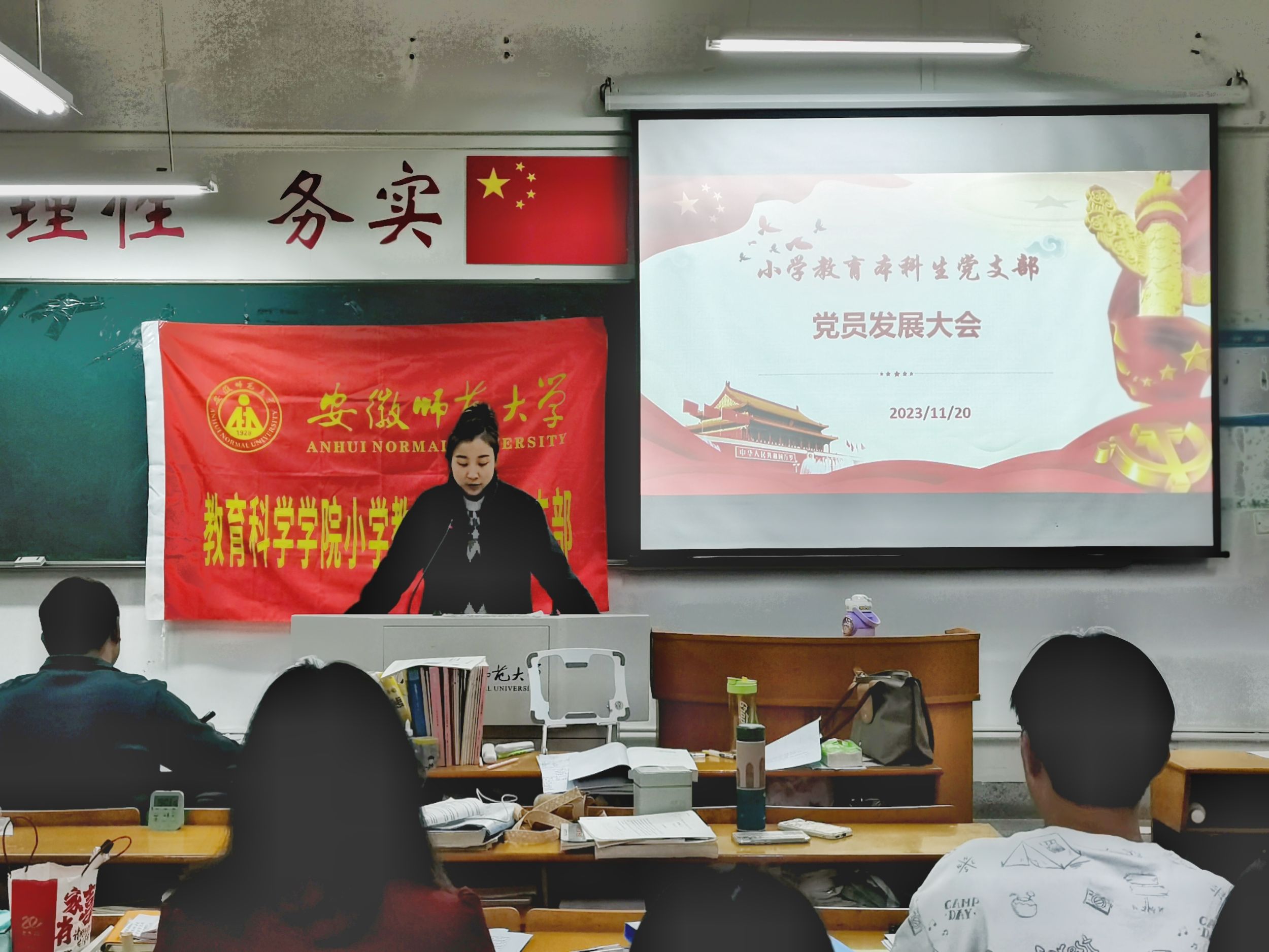 为进一步加强党员队伍建设,落实党支部发展党员工作计划,赓续红色血脉,凝聚奋进力量。2023年11月20日晚上,教育科学学院小学教育本科生党支部2023年下半年党员发展大会在田楼8205召开。小学教育本科生党支部书记程雅楠、党支部副书记莫大贡、支部全体党员及八名发展对象参加此次会议,大会由党支部书记程雅楠主持。