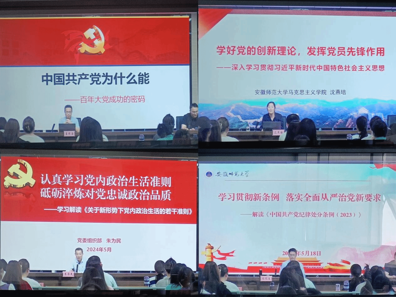 18日全天,培训班成员进行了专题讲座培训,讲座邀请了校党委常委、组织部部长朱为民,校纪委办公室案管审理室主任刘长生,马克思主义学院沈燕培和崔明海四位老师分别围绕认真学习党内政治生活准则 砥砺淬炼对党忠诚政治品质——学习解读《关于新形势下党内政治生活的若干准则》(以下简称《准则》)”“学习贯彻新条例 落实全面从严治党新要求——解读《中国共产党纪律处分条例(2023)》(以下简称《条例》)学好党的创新理论,发挥党员先锋作用——深入学习贯彻习近平新时代中国特色社会主义思想以及“中国共产党为什么能——百年大党成功的密码”的主题开展讲授。不同的授课教师多方位、多领域对中国共产党党史、党纪等内容进行了系统、深入的讲解,帮助学生进行更加全面的学习,进一步提升思想觉悟。其中朱为民主要从《准则》出台背景与重要意义、体系框架与主要内容以及践行路径与作用发挥这三大方面提升培训班成员对《准则》的进一步认识与了解刘长生主要从《条例》修订的主旨要义、主要内容等方面促进培训班成员认真学习宣传贯彻执行《条例》。沈燕培主要从习近平新时代中国特色社会主义思想的创立背景、主要内容、历史地位以及发挥党员先锋模范作用四个方面加大培训班成员对习近平新时代中国特色社会主义思想的进一步了解。崔明海主要从科学的理论指导伟大的精神力量强大的组织优势”“坚实的群众基础以及彻底的自我革命五个方面进行展开,通过抛出问题、结合实例环环相扣等方式生动展现了党的光辉历史,并启发培训班成员对党校学习的初心与使命进行更为深刻地认识。