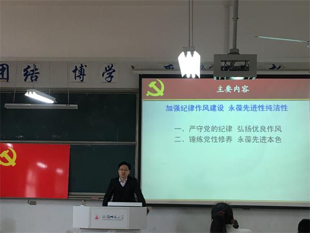 谢超峰围绕“严守党的纪律,弘扬优良作风”与“锤炼党性修养,永葆先进本色”两方面展开课程。他认为,党内各种问题的根源都始于党员的思想,思想的腐变又来源于对纪律认识的松动,因此严守党的纪律,是保持党性纯洁的必要条件。谢超峰老师结合鲜活实例讲述了红军时期、抗日与解放战争时期、建国初期、改革开放以来各阶段的党纪变化,其重要性不言而喻。随后,又深入讲述了党的纪律内容、特点与作用,党要“把好入口关,梳理出口关”,党员同志要提高自身要求,对照党的纪律要求,积极开展监督,自觉接受监督。此外,谢超峰带领全体党员同学学习了党风的建设与发展,择取罗列了一些共产党整顿党风与基层运动的事件,为党员同志保持党性纯洁敲响警钟。