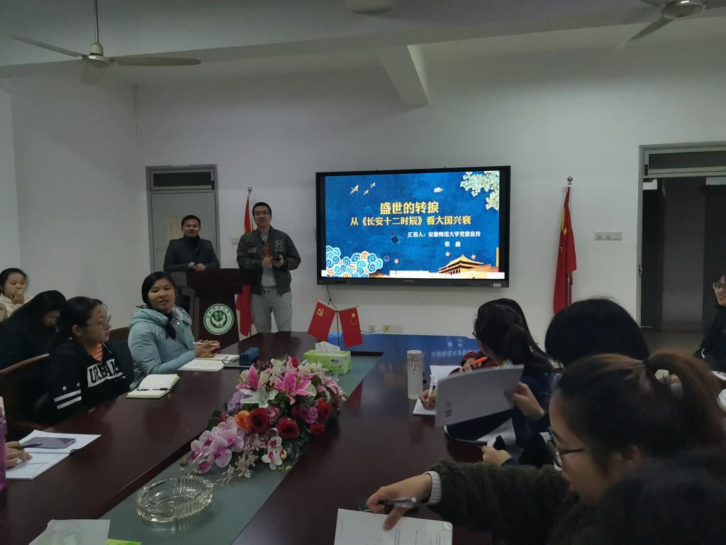 张鑫老师首先以当前中美贸易、香港暴乱等热点话题为引,提醒同学们要在纷繁复杂的舆论宣传中把握时代脉络,理清思想认识。他告诉同学们读史阅世能够知兴衰,并向同学们分享如何读史。随后,张鑫老师围绕假期网络热播剧《长安十二时辰》展开,结合众多历史资料和故事,向同学们详细介绍了中国古代盛世的“顶点”、“痛点”和“拐点”,并带领同学们从一个崭新的角度认识中国历史。在余论中,张鑫老师从政治、经济、贸易和科技四方面简略介绍了当今中国的发展,呼吁同学们树立文化自信,勇立时代潮头,担当民族复兴大任,为社会主义建设添砖加瓦。