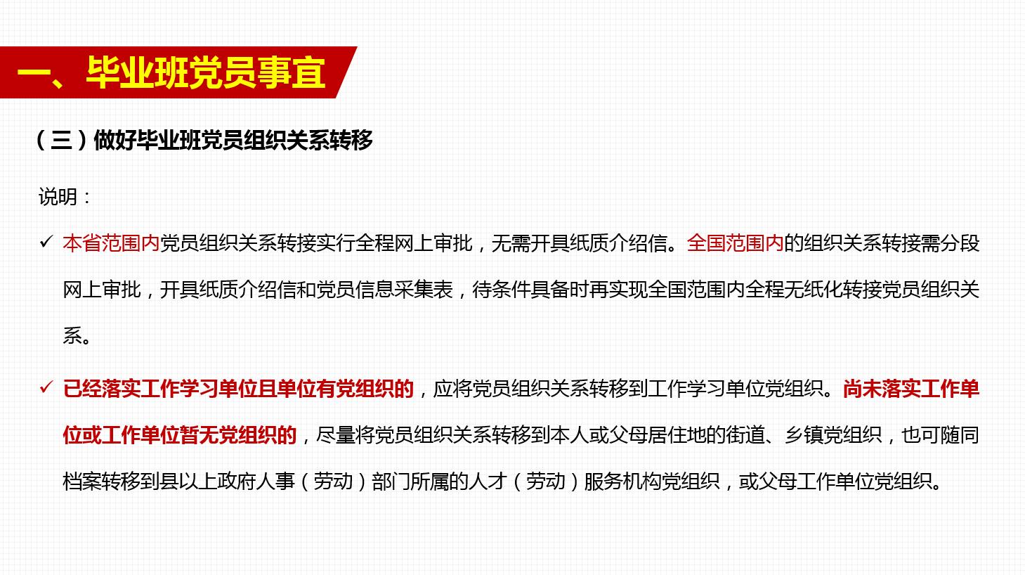 临近毕业,为加强思想教育,重点做好党组织关系转移教育,支部书记龚伟老师于6月3日组织开展了线上专题学习,通过PPT讲解与答疑两种方式全面帮助毕业班党员做好档案归档以及党组织关系转移工作的落实,指导毕业生党员规范准确填写《2020届毕业生党员组织关系转移登记表》和《毕业生党员组织关系转移情况统计表》,防止出现“口袋党员”“失联党员”。学习会上,针对大家提出的种种问题,龚伟老师均给予了耐心细致的解答,力求前期弄清楚,后期少问题。