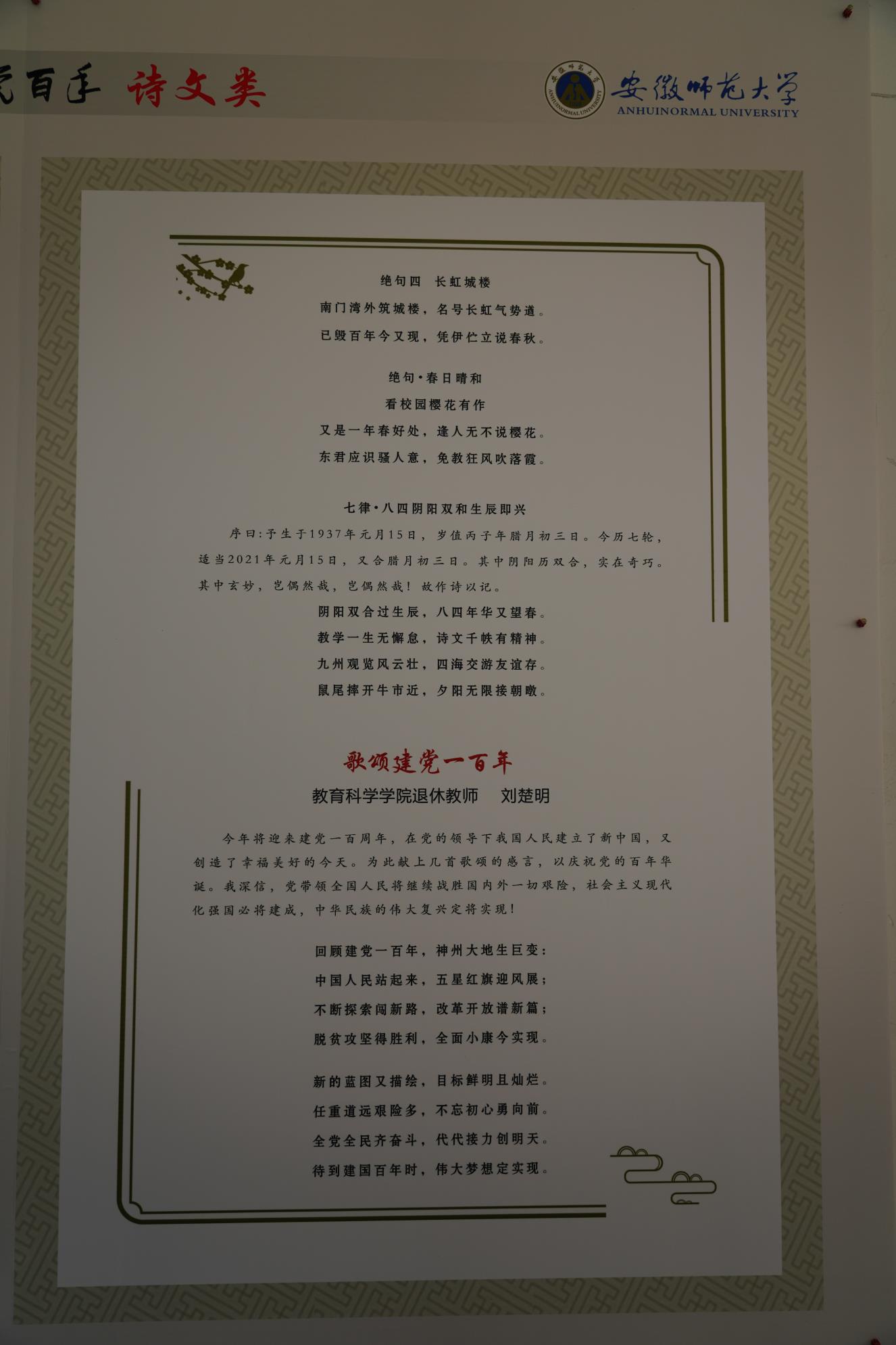 本网讯(院退教协 王守恒)在喜迎中国共产党成立100周年之际,由校离退休工作处和校退教协主办的“致敬中国力量,献礼建党百年”离退休教职工诗文、书画、摄影展日前顺利落下帷幕。此次展览活动是全校离退休教职工向中国共产党百年华诞献上的一份厚礼,活动开展以来,学院退休教工党支部、退教协分会在学院党委的领导和支持下积极组织退休教师参与此项活动,得到了老同志们的积极响应。本次展览全校共展出作品124篇(幅),其中教科院退休教师参展的作品15件,占所有参展作品的12%,不仅在参展单位中参展的作品数量最多、类型最全,包括杨克贵、刘楚明、王守恒老师的诗文作品5篇(首)、林若男、陈满堂老师的书画作品4幅、杨先海、庞世焕老师的摄影作品6幅。参展作品内容丰富、主题突出,或讴歌党的丰功伟绩特别是教育变革的光辉历程,或反映伟大祖国发展的精彩瞬间,或联系自身成长的过程感念党的培养教育之恩,用丹青妙笔表达对伟大祖国未来的期盼和衷心祝愿,凝聚着老同志对幸福生活的赞美,展现了老同志们奋斗不息、昂扬向上的精神风貌,受到展览组织者和广大观众的好评。