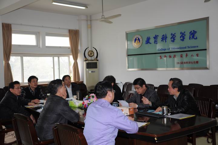 本网讯(教科院 柳丽娜)3月28日下午,来自省内六所高师院校教育科学学院的10余位专家齐聚在我校,围绕全省高师院校教师教育类专业改革与发展、学院之间的合作与交流等主题进行了深入的研讨。安庆师范学院教育学院院长曹长德教授,合肥师范学院教师教育学院院长吴秋芬教授,阜阳师范学院教育科学学院院长汪明教授,淮南师范学院教师教育中心主任陈雍茹教授,淮北师范大学图书馆馆长王家云教授、教育学院副院长李怀龙教授和教育科学学院院长葛明贵教授、副院长桑青松教授、副院长阮成武教授、院教授委员会主任周兴国教授等参加了会议。会议在教科院会议室举行,由葛明贵主持。