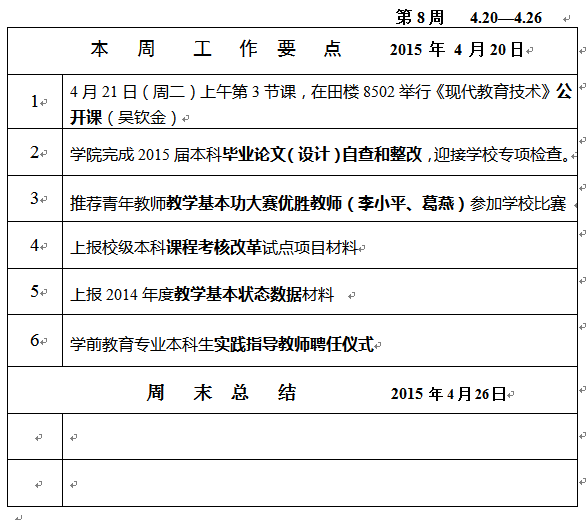 教育科学学院2014-2015学年第二学期教学工作第8周周报表