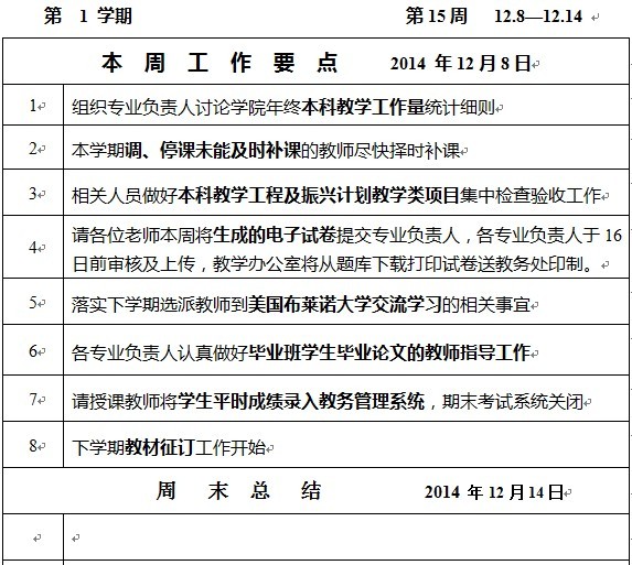教育科学学院2014-2015学年第一学期教学工作第15周周报表