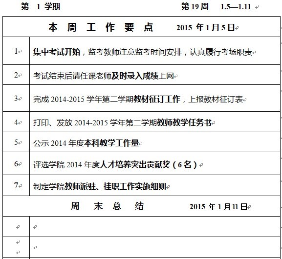 教育科学学院2014-2015学年第一学期教学工作第19周周报表