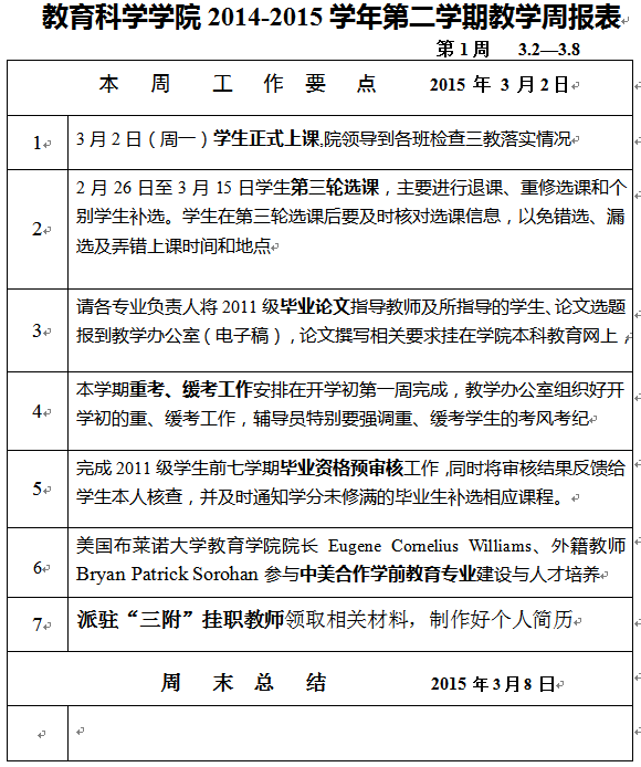 教育科学学院2014-2015学年第二学期教学工作第1周周报表